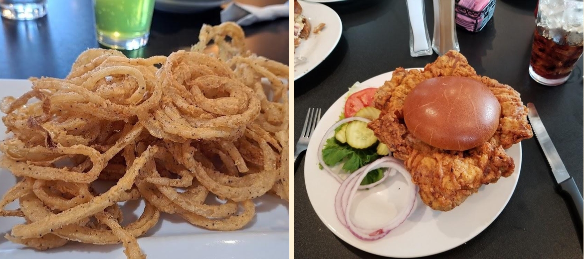 "We stayed at an airbnb nearby and had a few suggestions to dine. We chose to come here. The waitress made suggestions for the special, the brown sugar bourbon pork chop, baked potatoes, with a salad bar option. Yes!!! Was my answer! Sold! The salad bar was clean, and the lettuce was cut for bite size. It's not a huge salad bar but very good. Now, to this pork chop. I was pleasantly surprised with the 2 chops on our plates. As thick as these chops are, they were cooked perfectly, that delicious sear crust was so....... good! Seriously, who can eat all of that!?? I love leftovers so....... Win! Win! There was only 1 waitress when we got there, and I appreciated the heads up from the host. I asked the waitress how many cooks there was in the back cooking this delicious meal. She said 1. 1? Wow, there were about 6 tables, and I didn't think there was much time waiting for our meals with 1 cook. I only asked because I wanted to give the cooks a tip as well. Kudos for these gals running the show. Thank you for a great meal!!! Those onion things are really good!!! Great flavor, no dipping sauce needed!!! Don't forget to stock your Yuegling, please"