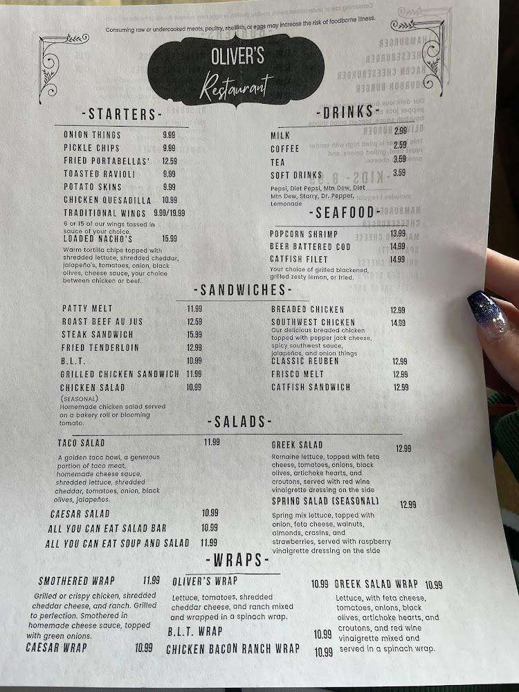 Oliver's menu features over 100 dishes, making it diverse and appealing. Turning to classic American cuisine, options range from sandwiches to hearty entrées.