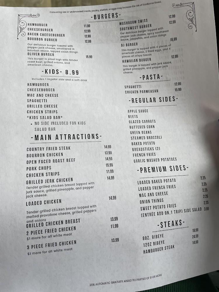 Popular items include the smothered wrap, chicken fried steak, and the bourbon burger. The all-you-can-eat salad bar allows guests to customize their meals with healthy selections.