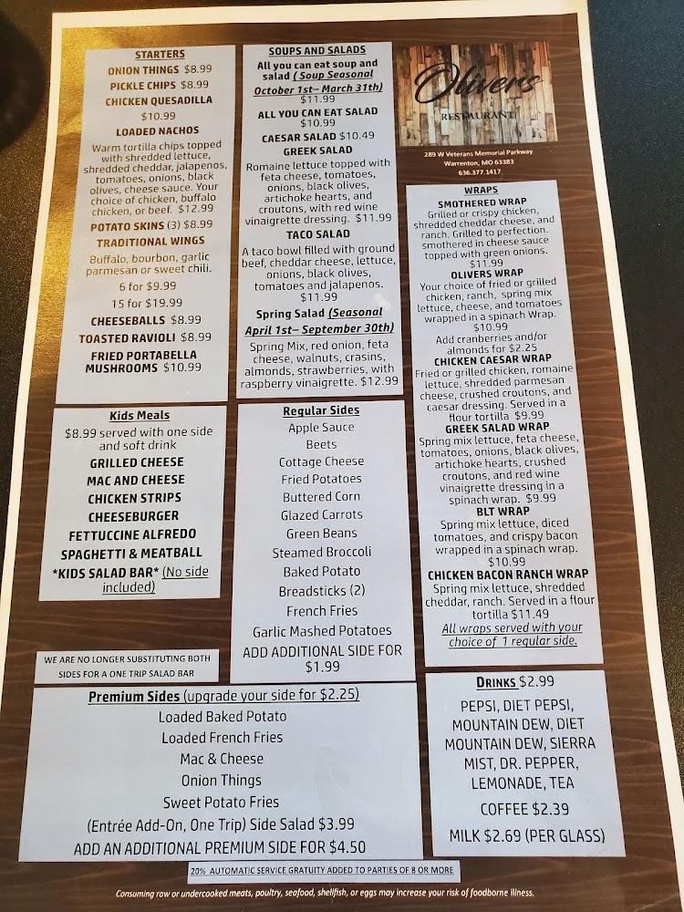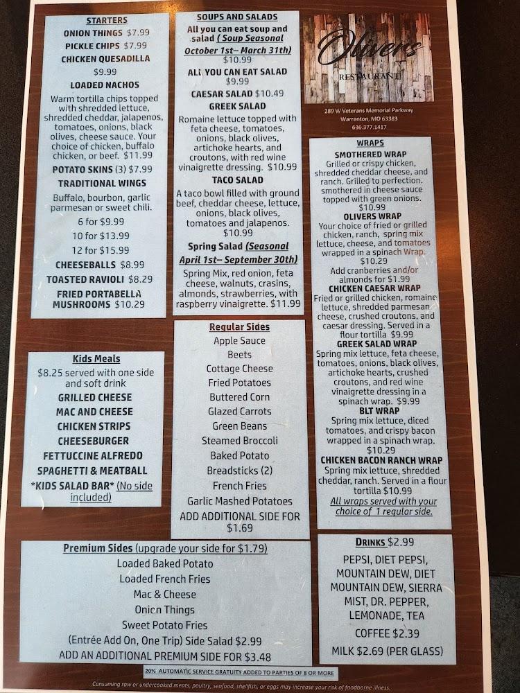Welcome to Oliver's, a charming eatery located in Warrenton, MO, where delicious food meets a relaxed atmosphere. Our menu features a delightful range of traditional dishes, exceptional coffees, and signature cocktails, perfect for breakfast, lunch, and dinner. Enjoy outdoor seating, quick takeout, or dine in with friends while indulging in our mouthwatering desserts and local specialties. With accessible facilities and a diverse selection of beverages, including craft beer and fine wines, Oliver's is ideal for solo diners and groups alike. Join us for an unforgettable culinary experience—reservations are welcome!